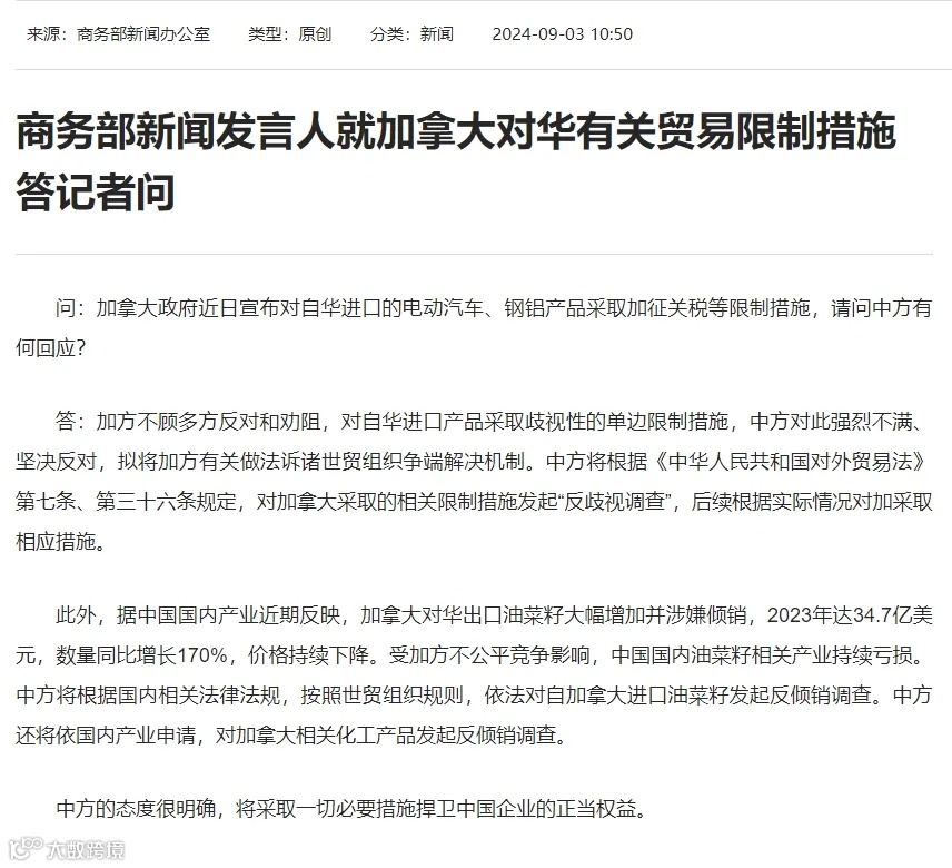 此外,据中国国内产业近期反映,加拿大对华出口油菜籽大幅增加并涉嫌倾销,2023年达34.7亿美元,数量同比增长170%,价格持续下降。受加方不公平竞争影响,中国国内油菜籽相关产业持续亏损。中方将根据国内相关法律法规,按照世贸组织规则,依法对自加拿大进口油菜籽发起反倾销调查。中方还将依国内产业申请,对加拿大相关化工产品发起反倾销调查。