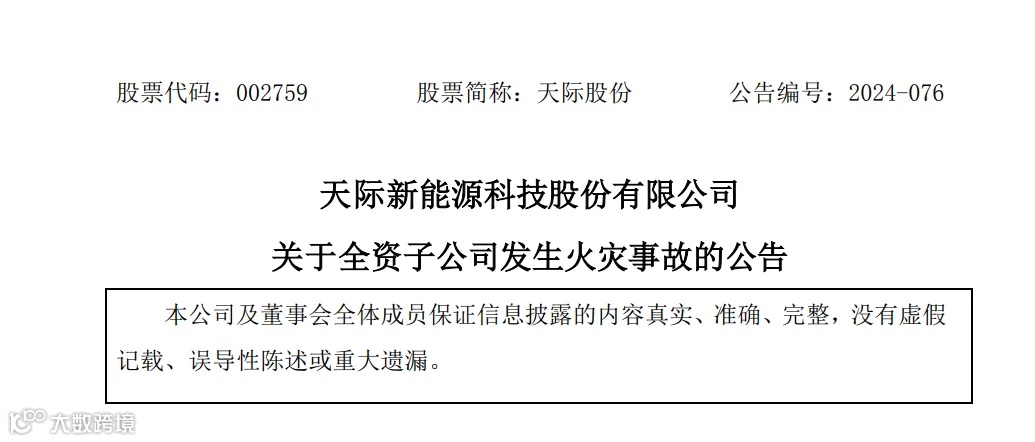 天际股份8月26日早间公告,2024年8月24日上午10时左右, 天际新能源科技股份有限公司(以下简称“公司”)全资子公司江苏新泰材料科技有限公司(以下简称“新泰材料”)三个车间中的二车间四楼电气线路短路发生局部火灾事故。