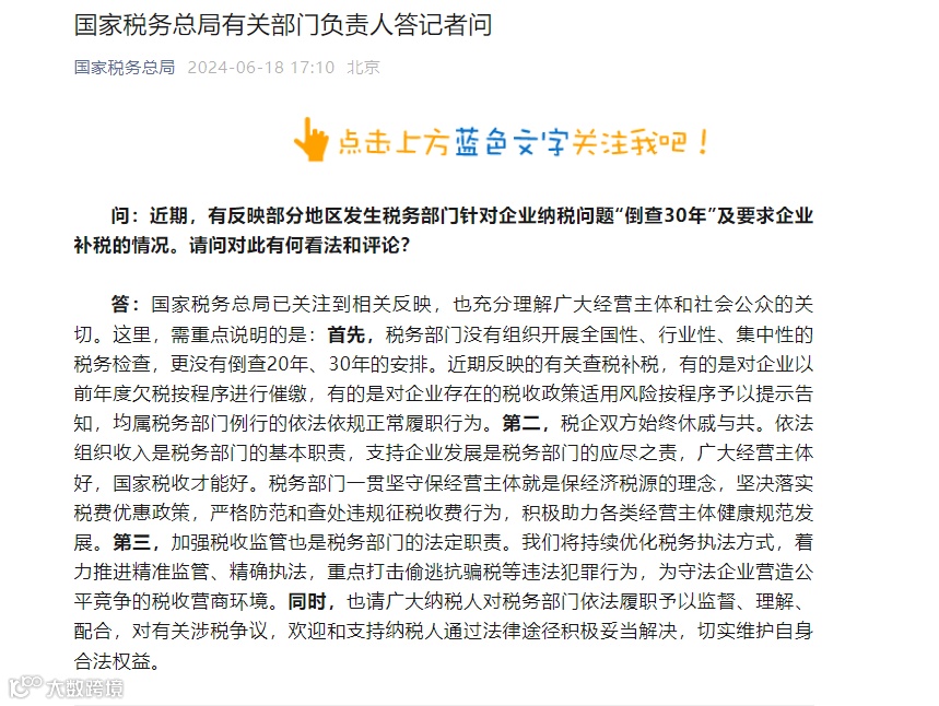 问:近期,有反映部分地区发生税务部门针对企业纳税问题“倒查30年”及要求企业补税的情况。请问对此有何看法和评论?