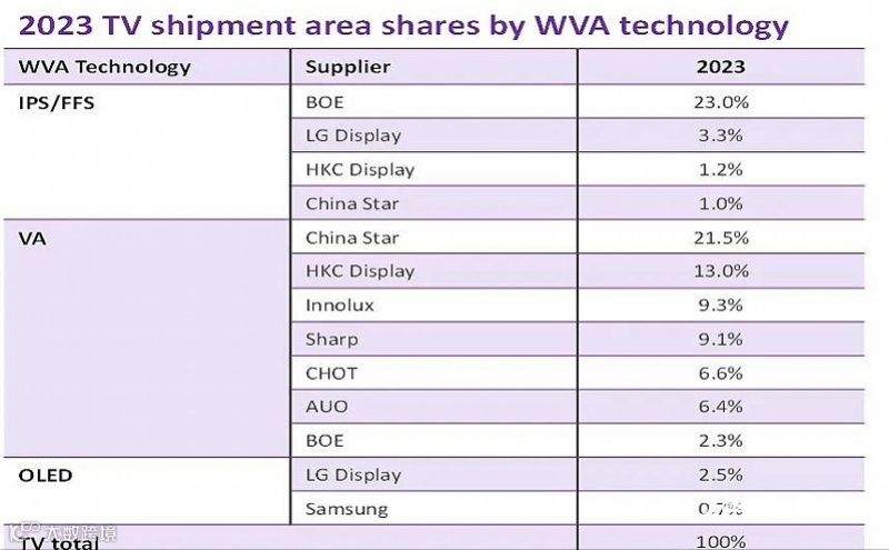 以广视角技术类别来分,2023年,京东方的IPS/FFS(京东方名ADS)技术电视面板出货面积占比23%,独占第一位。华星光电的VA技术电视面板出货面积占比21.5%,位列第二,惠科的VA技术电视面板出货面积占比13%,位列第三。