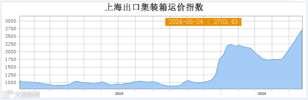 自4月底以来,即期运价开始飙升。5月24日,上海出口集装箱综合运价指数为2703.43点,实现七连涨;相比4月19日上涨了52.8%,创下2022年9月以来的最高点。