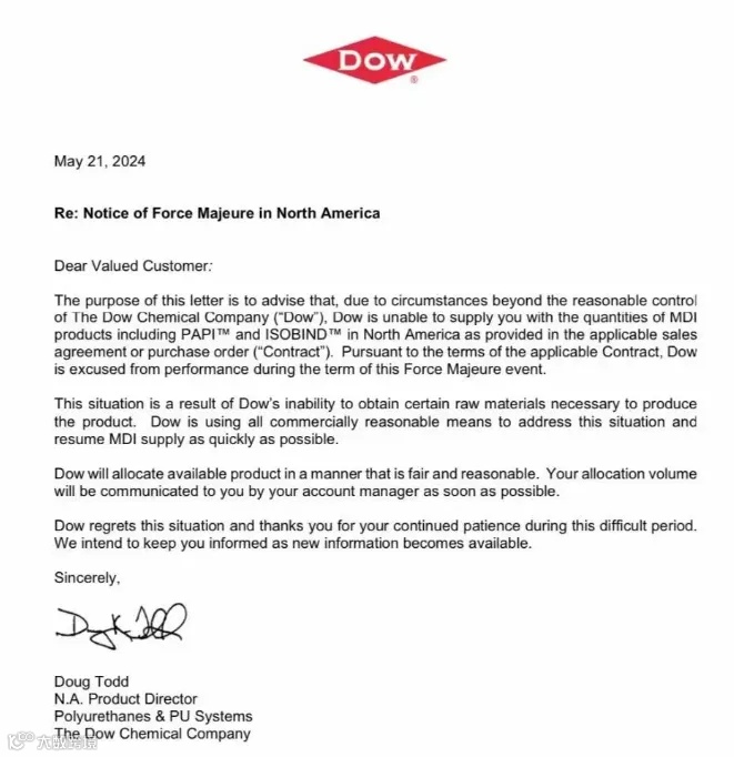 近日,海外化工龙头企业陶氏宣布,其美国Freeport的44万吨/年的MDI装置,因MDI因原料供应问题出现不可抗力。