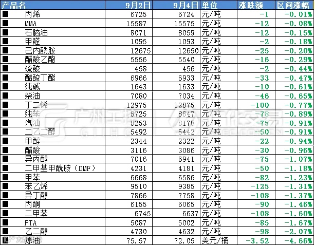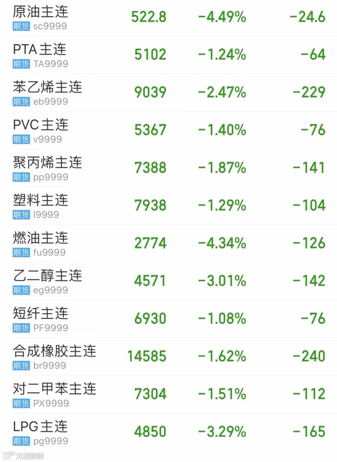 受外盘影响,国内原油开盘直线下挫,截至9月4日下午收盘,原油主连仍大跌4.49%,直接带崩全场:燃油盘内大跌4.34%、LPG下跌3.29%、苯乙烯下跌2.47%、PTA跌1.24%、聚丙烯主连下跌1.87%、PVC下跌主连下跌1.40%、塑料主连下跌1.29%…