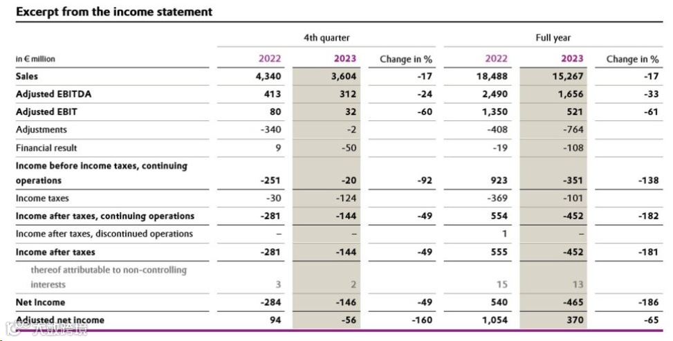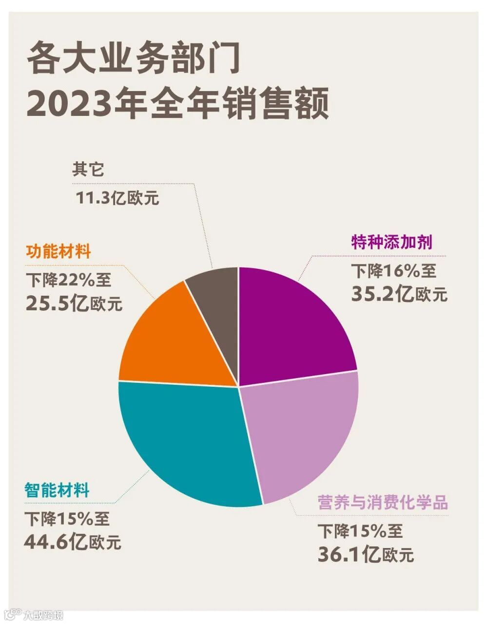 3月4日,特种化工巨头赢创发布2023年年度业绩:销售额153亿欧元,同比下降17%;息税折旧及摊销前利润(调整后EBITDA)16.6亿欧元,同比下降33%;自由现金流8.01亿欧元,同比增长2%。