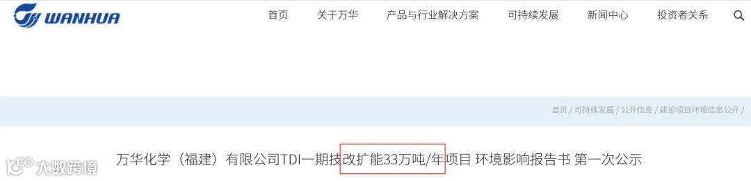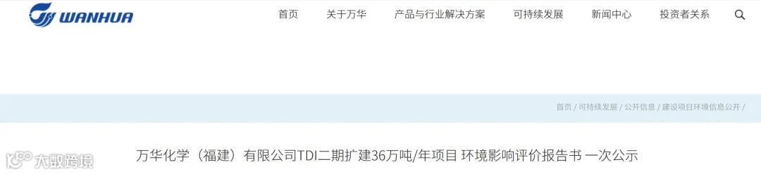 4月18日,万华化学官网发布《万华化学(福建)有限公司TDI二期扩建36万吨/年项目环境影响评价报告书一次公示》。