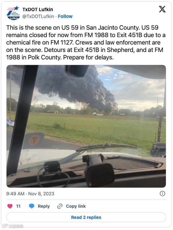 美国59号高速公路从 FM 1988 至 451B 出口已全部关闭,途径的车辆全部被要求避开该区域。