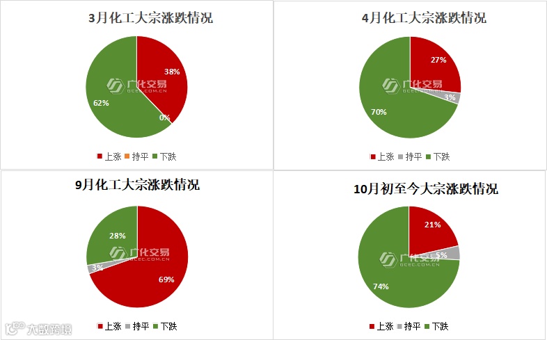 十月即将结束,预示着今年的传统旺季也走向尾声。小编发现,今年的传统旺季,除了9月涨多跌少外,3月、4月、10月均以下跌为主,其中4月、10月的下跌品类占比超70%,有机硅、双酚A、电池三巨头均在下行名单中。直观的数据表明,今年的化工行情异常艰难,“旺季无望”似乎已经进入寒冬。