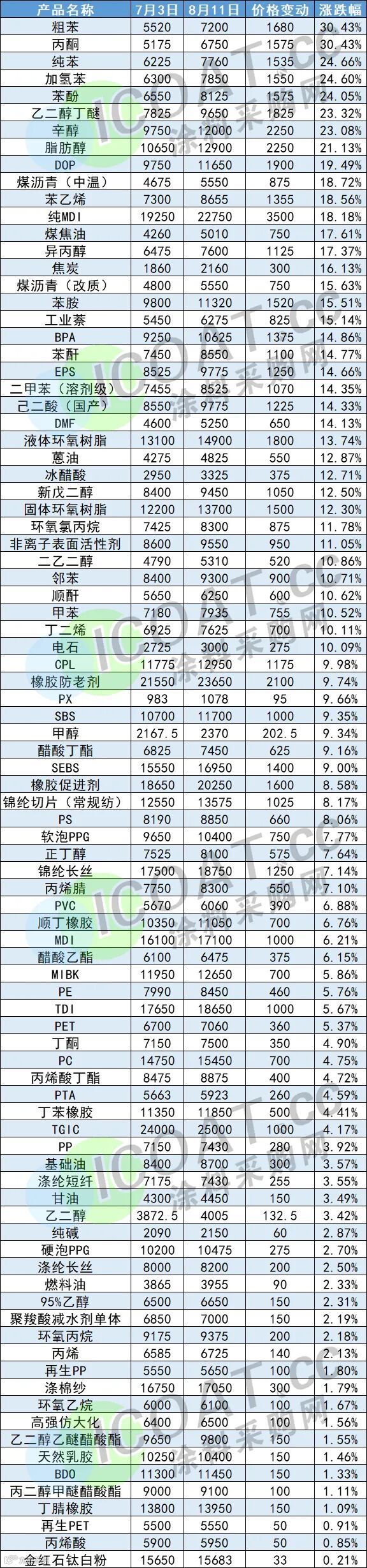 尽管下半年仅过了不到2个月,但化工市场却呈现出一发不可收拾的涨价态势,丙二醇、纯苯、粗苯、MDI、环氧树脂等90多种化工品价格上升,吨价最高上涨3500元,涨幅最高超过30%。