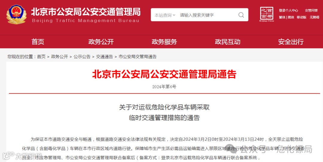 全国两会期间,为保证本市道路交通安全与畅通,自2024年3月2日0时至2024年3月13日24时,全天禁止运载危险化学品(含剧毒化学品)车辆在北京市行政区域内道路行驶。