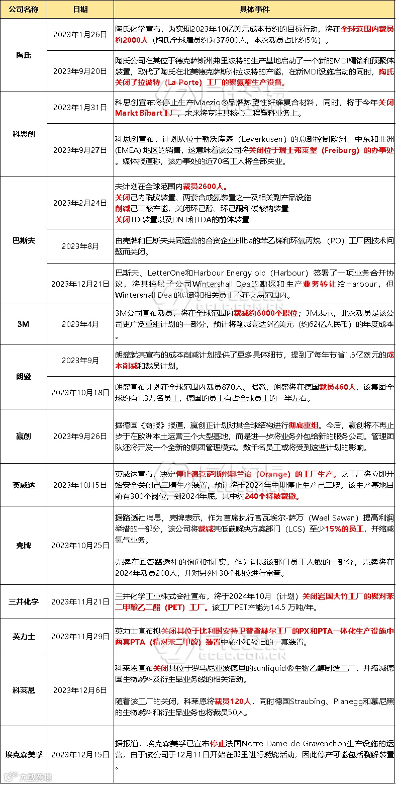 不只是陶氏,整个2023年对于许多行业巨头来说都很艰难,哪怕是像巴斯夫、科思创、壳牌等这样的化工巨头,也避免不了要选择关厂、裁员、出售、并购的方式来“求生”。