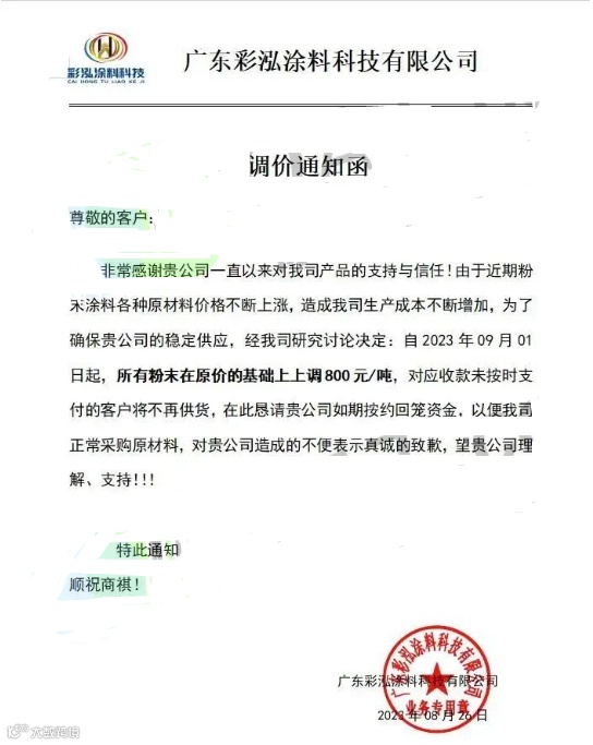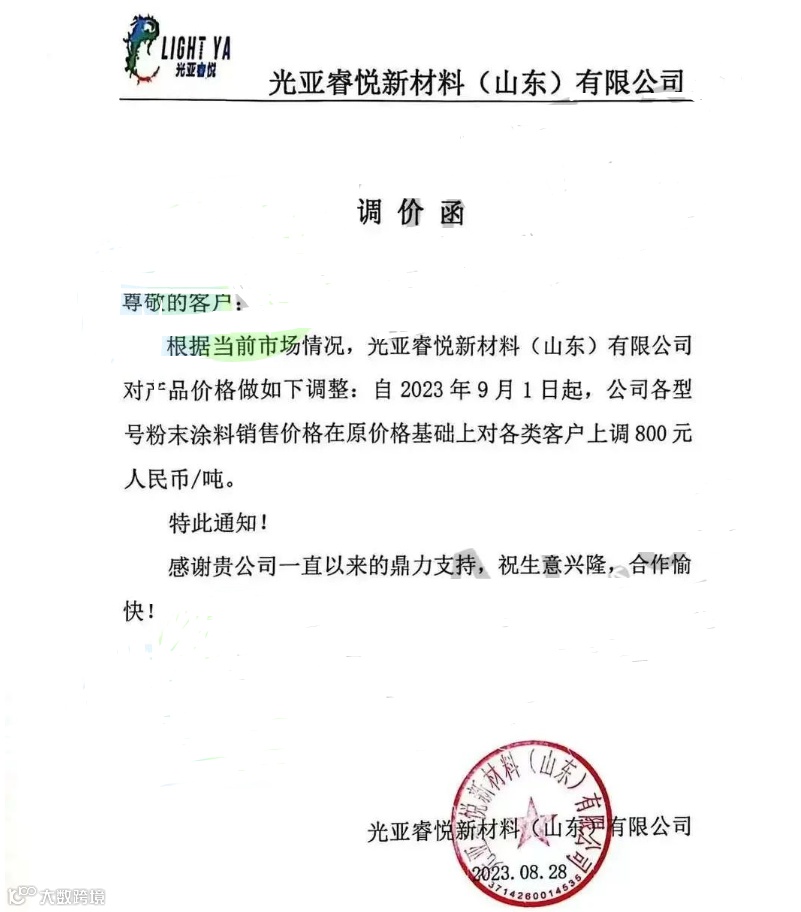 8月28日,光亚睿悦新材料发布调价函,称9月1日起,各型号粉末涂料销售价格在原价格基础上对各类客户上调800元人民币/吨。