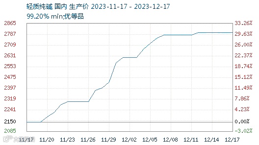 纯碱12月17日最新价格2800.00元/吨,最近20天上涨17.65%,30天上涨30.23%。