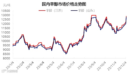 自三季度开始,国内辛醇价格迎来强势上涨,第三季度均价11410元/吨,环比上涨19%!进入四季度后,国内辛醇市场价格受供应端因素影响震荡上行,从月度走势来看,10月份辛醇市场处于下跌通道,11月份辛醇刚性需求增加,价格震荡上行。进入12月份后,国内辛醇市场价格持续上涨,价格继续上行突破13000元/吨年内新高,价格较11月初涨幅高达近20%。