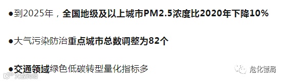 化工领域:坚持PM2.5改善为主线,明确PM2.5的下降目标;坚持系统治污,大力推进产业、能源、交通结构调整,尤其交通领域的绿色低碳转型量化指标最多,突出氮氧化物、VOCs等多污染物协同减排;强化联防联控,京津冀及周边地区已经由“2+26”城市调整为“2+36”城市,长三角与京津冀协同打通,整体解决东部地区的大气污染。