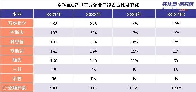 巴斯夫、科思创、亨斯迈产能占比由2023年的17%、16%、12%,预计到2026年占比达到19%、15%、11%;可以看出,除了巴斯夫外,另外两大巨头占比预计下滑。