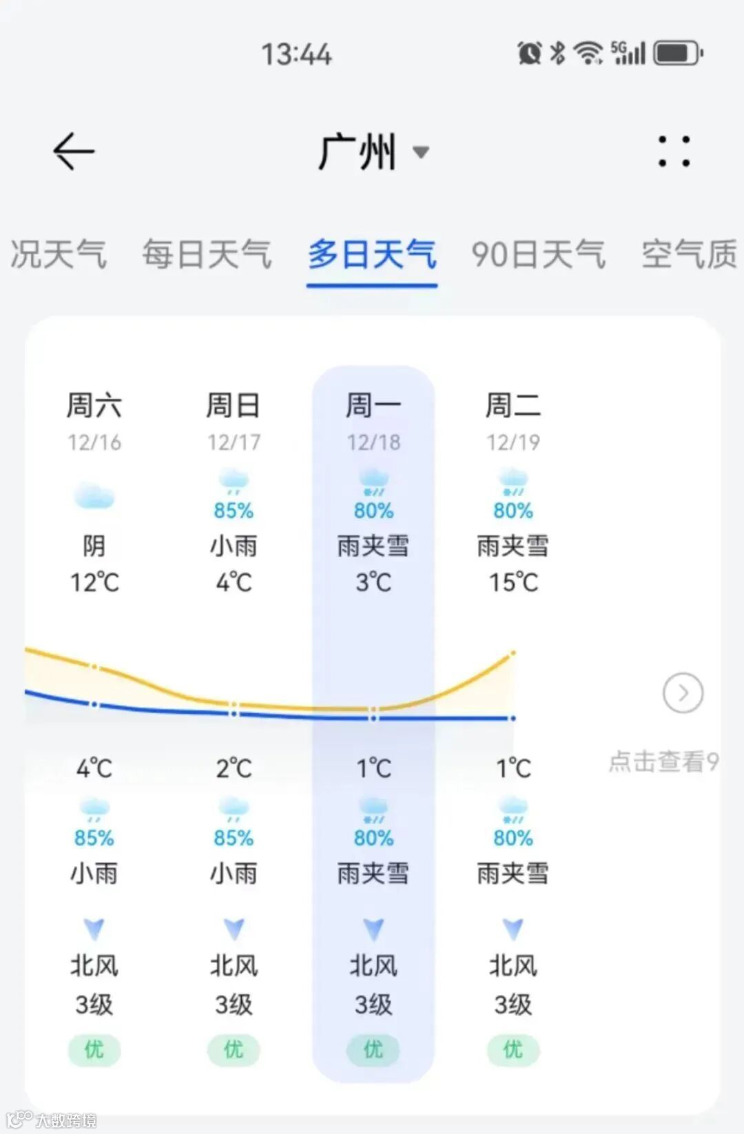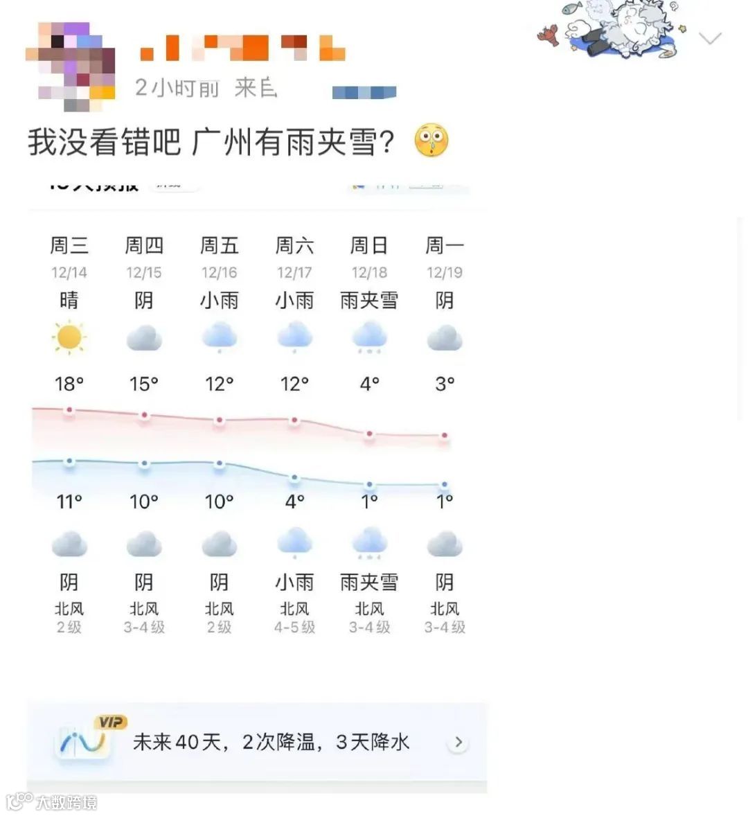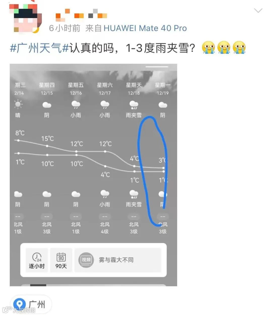 广州要下雨夹雪?12月4日,有网友反映自己手机中的天气APP12月18日前后广州出现气温明显偏低走势,部分预报结论更指出12月18日广州可能出现雨夹雪。
