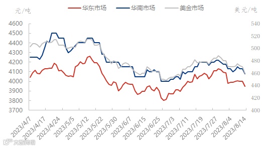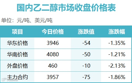 8月14日张家港乙二醇收盘价格在3946元/吨,下跌54,华南市场收盘送到价格在4080元/吨,下跌50,美金收盘价格在460美元/吨,下跌10。