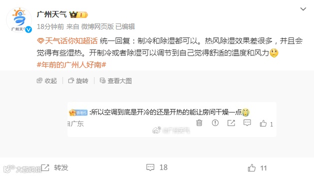 对此,@广州天气回复:制冷和除湿都可以。热风除湿效果差很多,并且会觉得有些湿热。开制冷或者除湿可以调节到自己觉得舒适的温度和风力。