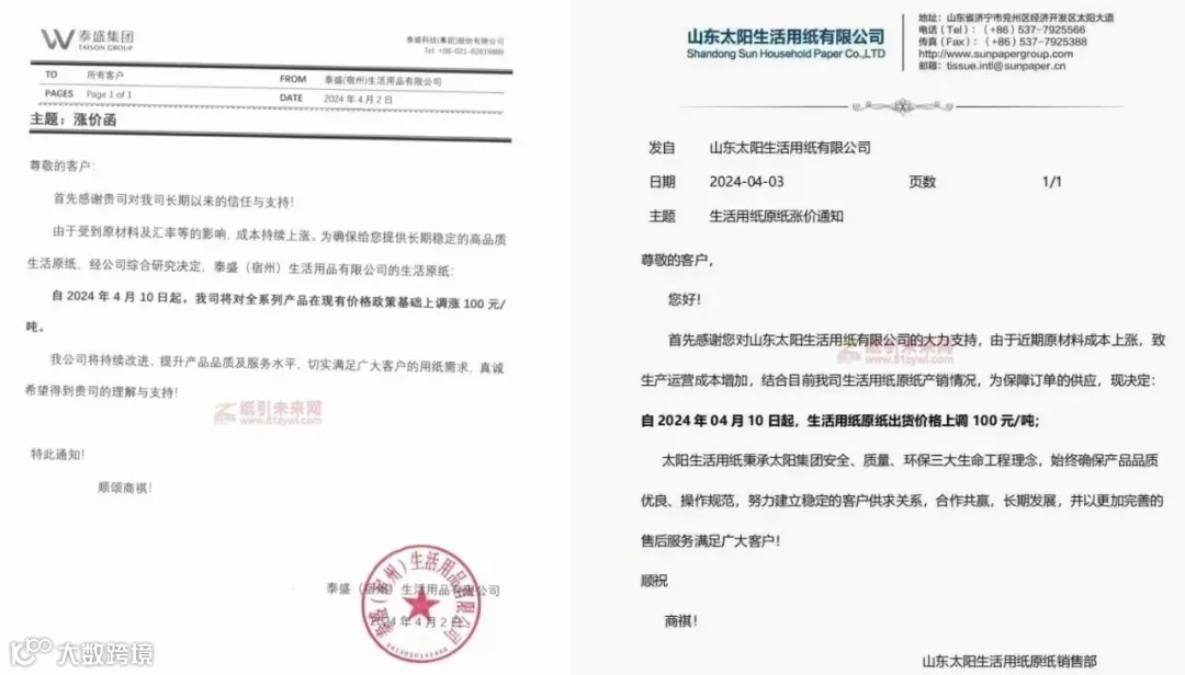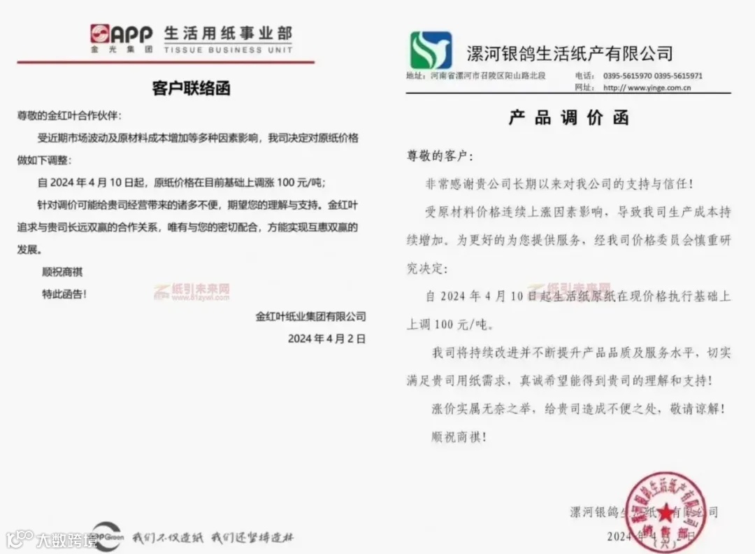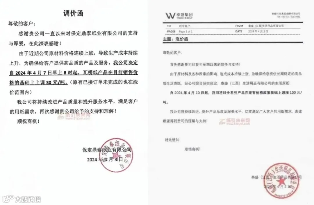 多家纸企发布涨价函,称受市场波动与原材料价格上调影响,成本增加,纷纷上调原纸价格,调价范围涉及瓦楞纸、生活原纸、本色转移印花纸,最高上调500元/吨。