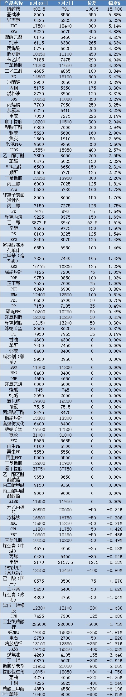 其中硫酸铵、基础油、异丙醇,涨幅分别为15.90%、6.88%、6.23%;值得注意的是,其中MMA、TDI、辛醇、脂肪醇等吨价上涨超1000元。