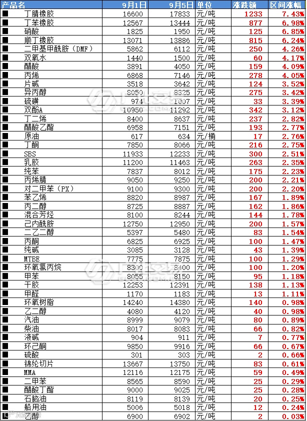 在“金九”的加持下,大宗原料也“打的火热”,据监测数据显示,步入九月5天的时间里,已有47种原料出现上涨,其中,丁腈橡胶5天累计暴涨1233元/吨,涨幅超7%。