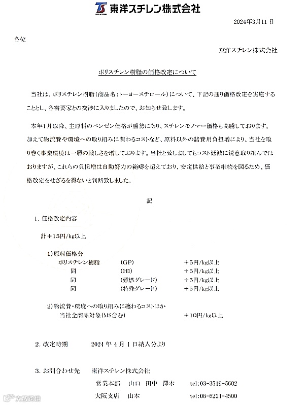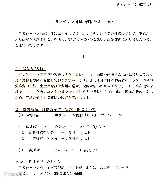 4月对聚苯乙烯树脂“PSJ聚苯乙烯”涨价20日元/kg(约合人民币954元/吨)!