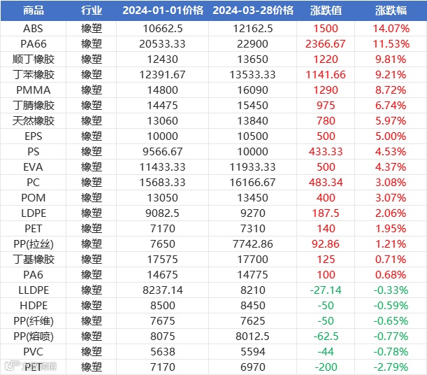 据数据统计,从2024年1月初至2024年3月28日,橡塑板块环比上涨的有17种,其中塑料品类涨幅前3的商品分别为ABS、PA66、PMMA,其中PA66涨额超2300元/吨,ABS涨幅达14.07%。