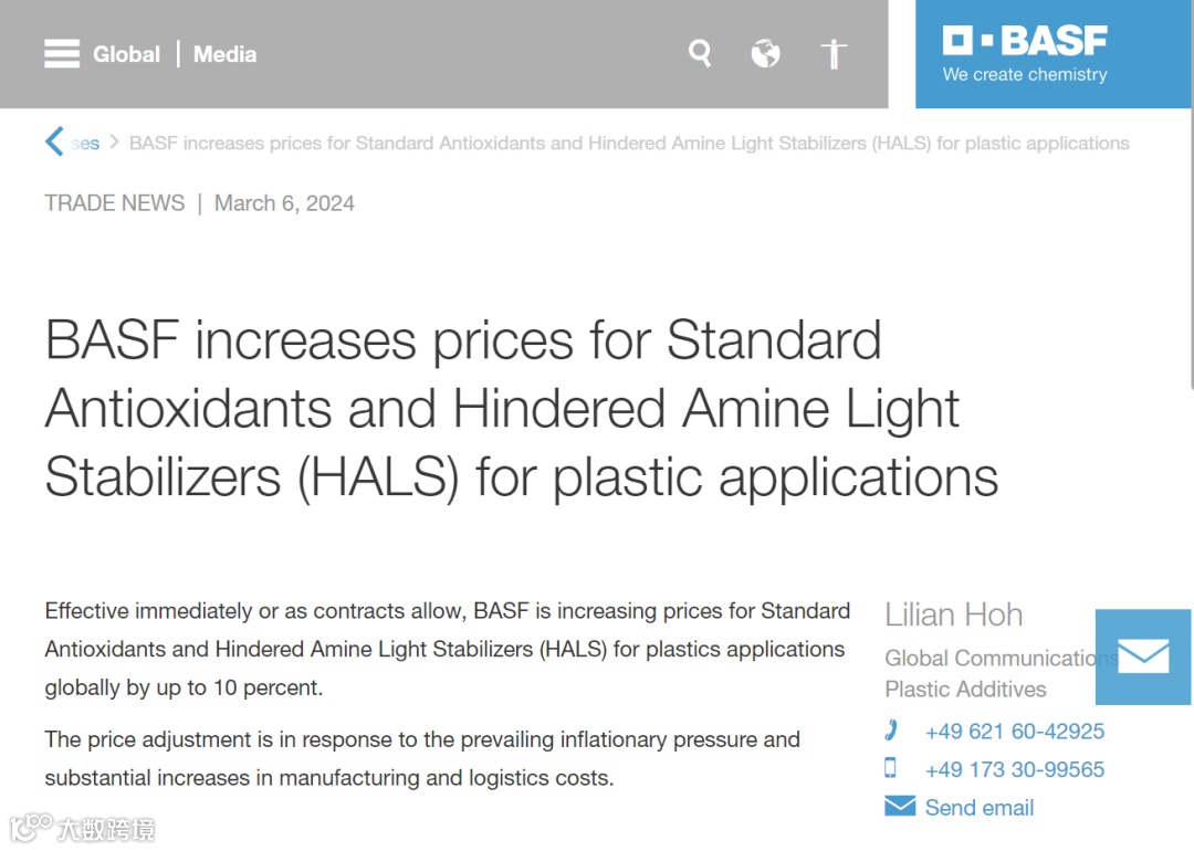 为应对通货膨胀及制造和物流成本上升,巴斯夫决定提高将塑料用标准抗氧化剂和受阻胺光稳定剂的价格上调10%,即日起或根据合同规定生效。