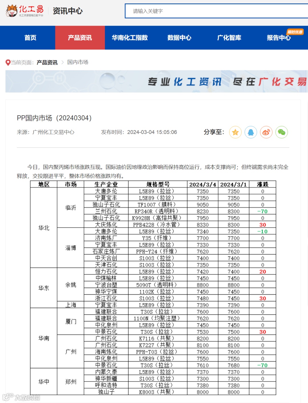 根据广化交易数据监控,3月4日,国内聚丙烯市场涨跌互现。国际油价因地缘政治影响而保持高位运行,成本支撑尚可;但终端需求尚未完全释放,交投跟进平平,整体市场价格涨跌均有。