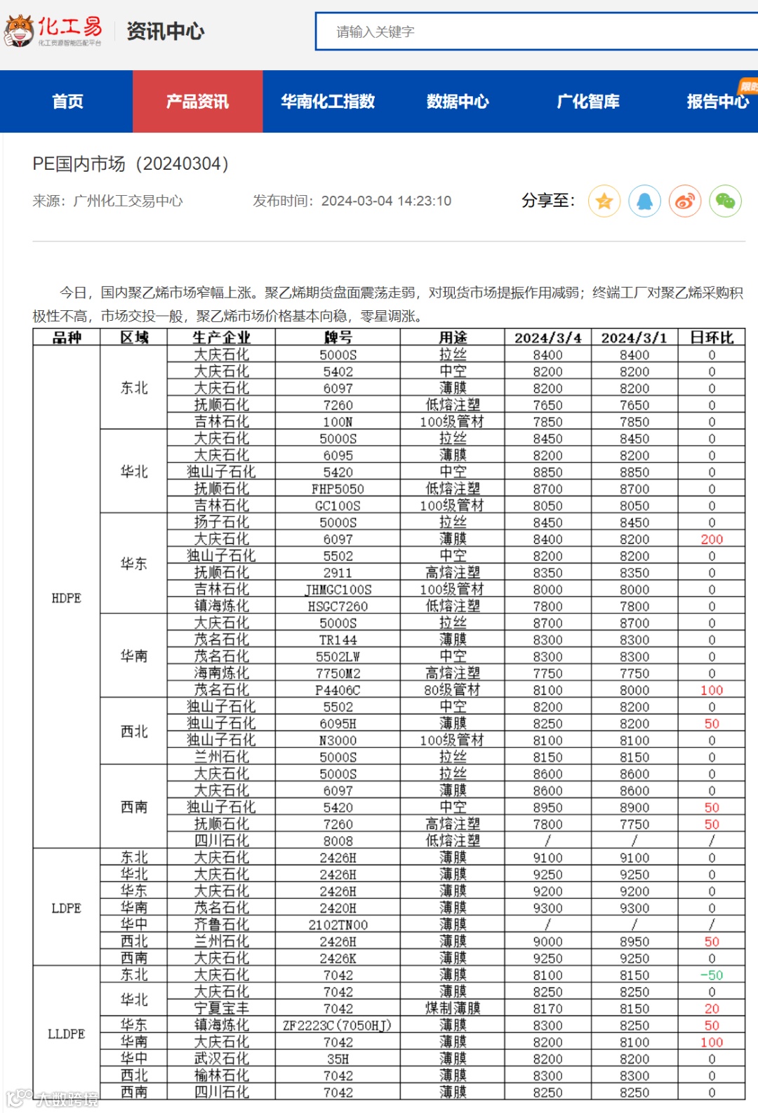 国内聚乙烯市场窄幅上涨。聚乙烯期货盘面震荡走弱,对现货市场提振作用减弱;终端工厂对聚乙烯采购积极性不高,市场交投一般,聚乙烯市场价格基本向稳,零星调涨。