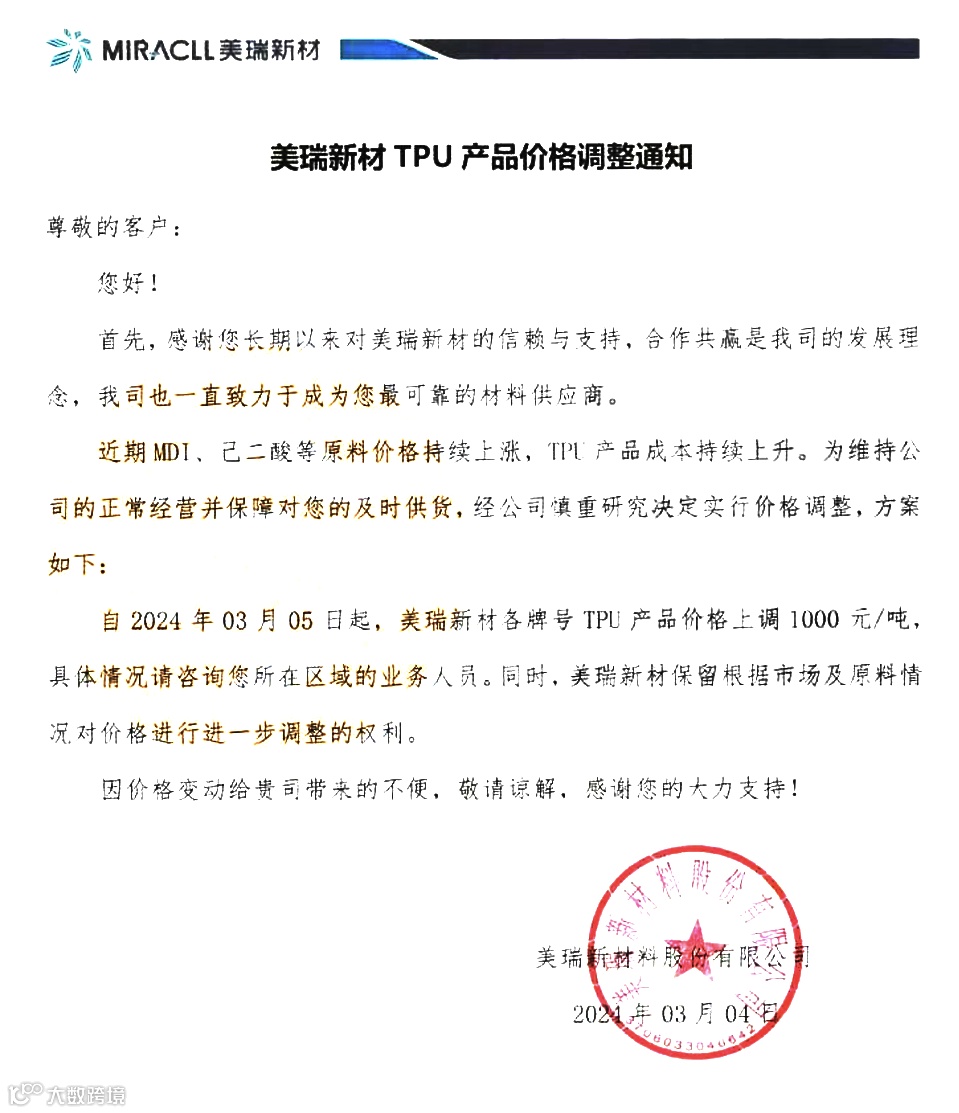 ▶▶3月4日,美瑞新材发布涨价通知称因近期MDI、己二酸等原料价格持续上涨,TPU产品成本持续上升。为维持公司的正常经营并保障及时供货,经公司慎重研究决定实行价格调整,方案如下:自2024年03月05日起,美瑞新材各牌号TPU产品价格上调1000元/吨。同时,美瑞新材保留根据市场及原料情况对价格进行进一步调整的权利。