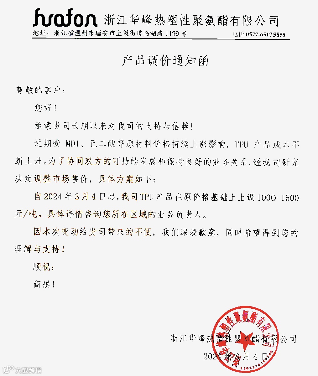 ▶▶3月4日,浙江华峰发布涨价通知,将旗下TPU产品在原价格上调1000-1500元/吨。