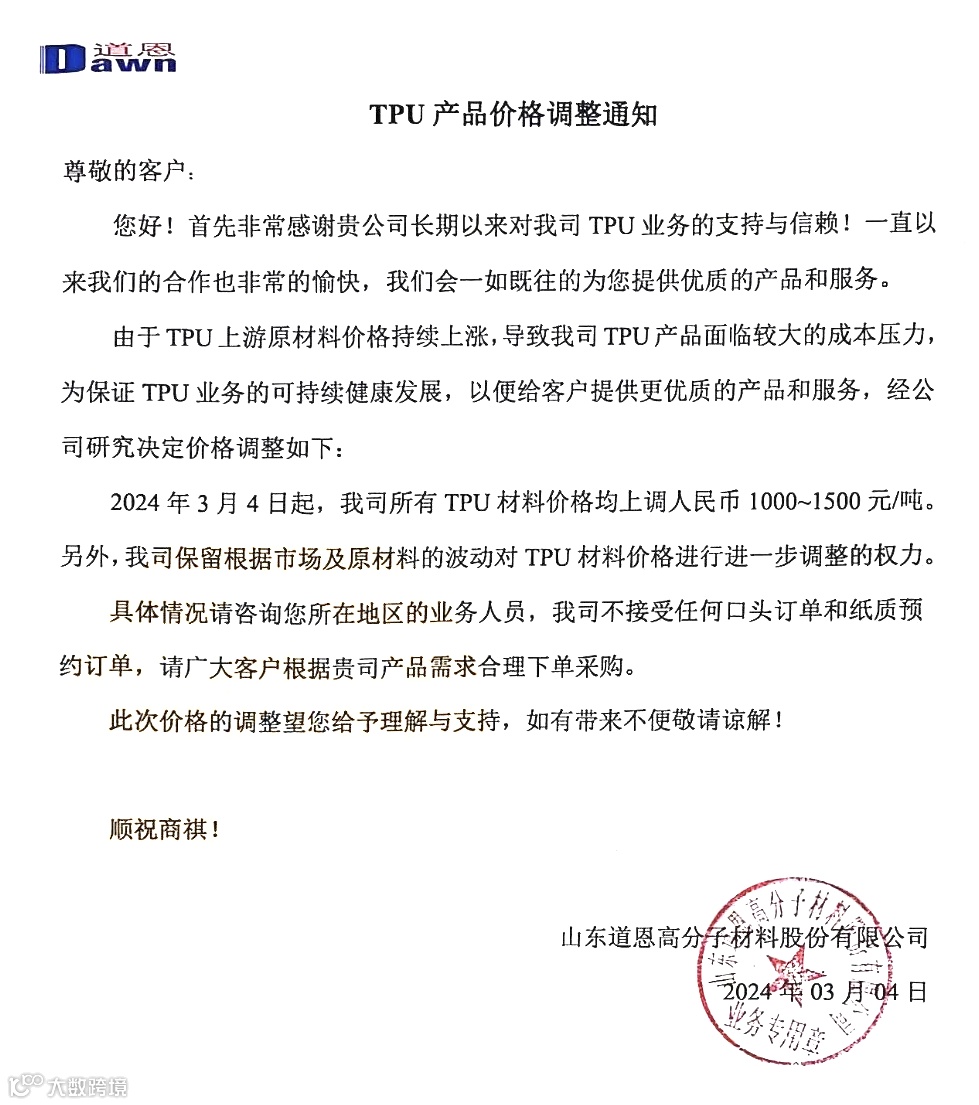 ▶▶3月4日,山东道恩也发布涨价函,将所有TPU材料价格均上调人民1000~1500元/吨。另外涨价函还提到“我司保留根据市场及原材料的波动对TPU 材料价格进行进一步调整的权力。”