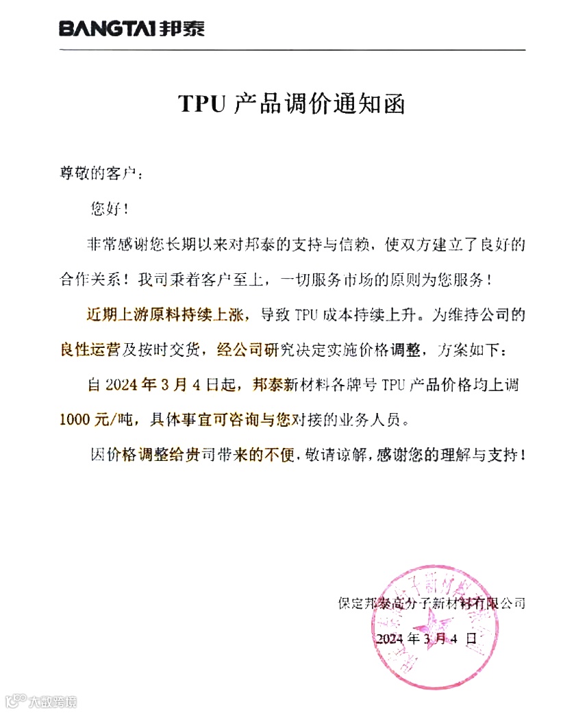 ▶▶保定邦泰发布涨价通知称近期上游原料持续上涨,导致TPU成本持续上升。为维持公司的良性运营及按时交货,经公司研究决定实施价格调整,方案如下:自2024年3月4日起,邦泰新材料各牌号TPU产品价格均上调1000元/吨,具体事宜可咨询与您对接的业务人员。