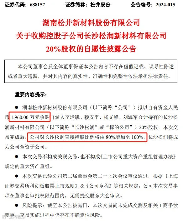 近日,松井股份公告,拟以自有资金1960万元收购自然人李运凯、赖安平、杨义峰、刘海军合计持有的长沙松润20%股权。本次交易完成后,松井股份对长沙松润直接持股比例将由80%增加至100%,长沙松润将成为公司全资子公司。