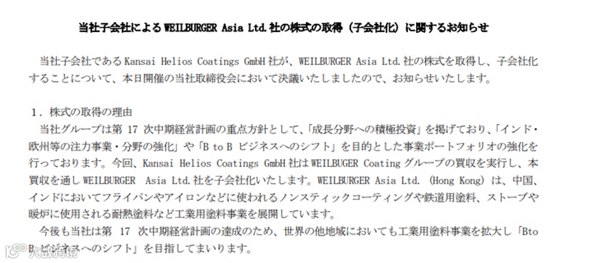 威堡亚洲有限公司的工业涂料业务将被关西涂料欧洲子公司Helios收购,涵盖威堡在欧洲、美洲、亚洲等地的生产基地。收购价格38.86亿日元,收购完成后,关西涂料还将持有威堡亚洲的子公司威堡天津和威堡投资的股份。