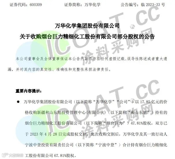 新疆和山东旭投资管理中心(有限合伙)持有的烟台巨力精细化工股份有限公司47.81%股权,被万华化学集团股份有限公司收购。