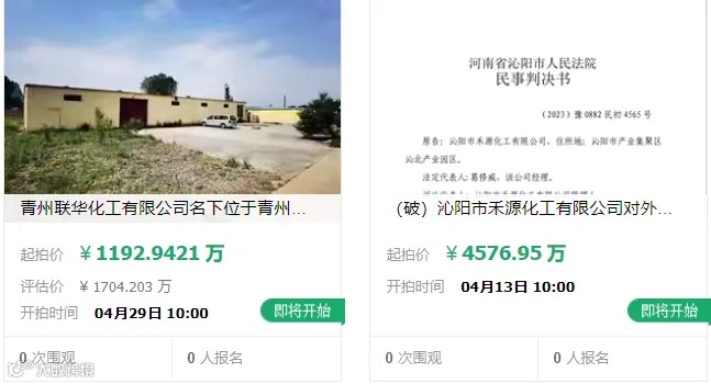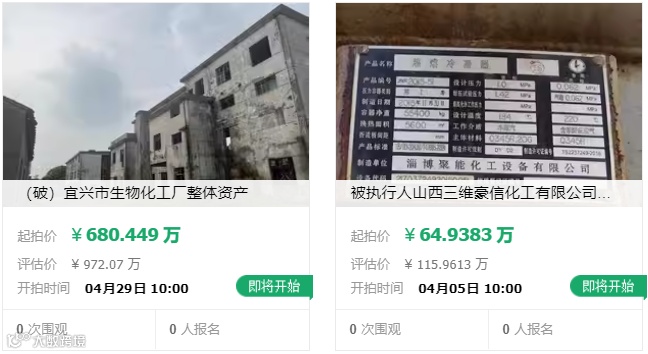 在某法拍网站上,部分涂料、化工企业由于破产倒闭,被进行资产、股权的拍卖,最高超过9亿元,包括化工企业名下的土地使用权及其地上在建工程和机器设备,而低至千元以下的气动泵、灯具等多个日用品类目也频频出现。