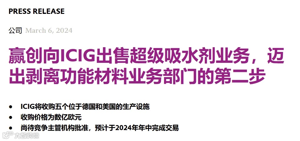 赢创与国际化工投资者集团(ICIG)签署协议,将出售其超级吸水剂业务。收购价格达数亿欧元,预计将于2024年年中完成交易。