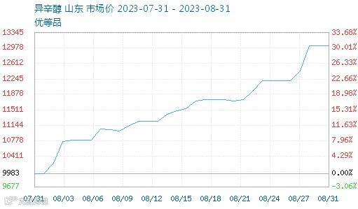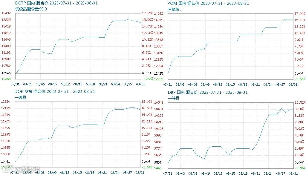 受异辛醇价格暴涨影响,其下游多个产品如DOTP、POM、DBP、DOP价格均有上涨。DOTP近月内价格上涨超1500元/吨,涨幅近15%;DOP一月价格上涨1560元/吨,涨幅超16%;POM月内价格上涨近2000元/吨,涨超15%;DBP价格一月上涨近千元,涨幅近10%。