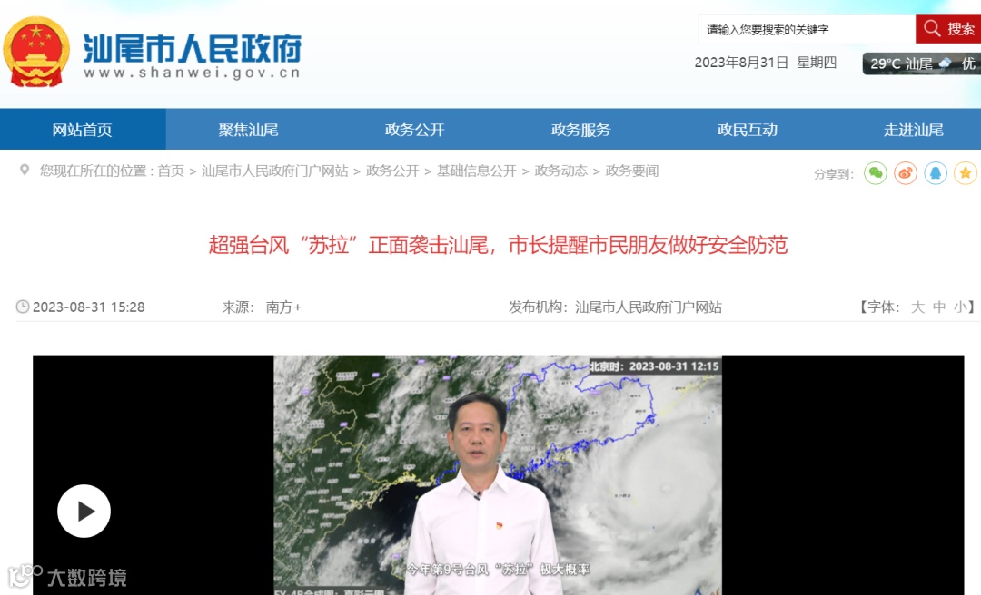 31日,汕尾市防汛防旱防风指挥部发布预公告,鉴于“苏拉”极大概率将于9月1日在汕尾正面登陆,计划于9月1日零时起到防台风Ⅰ级应急响应结束前,在全市范围内实行停课、停工、停产、停运、停业等“五停”措施。