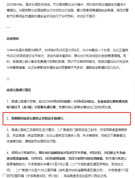 9月29日0时前已经进入高速公路行驶的危险化学品运输车辆,需就近驶离高速公路。