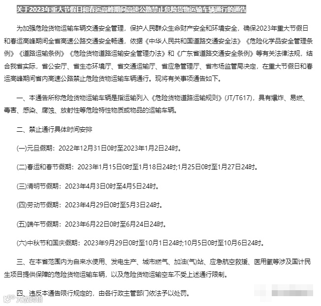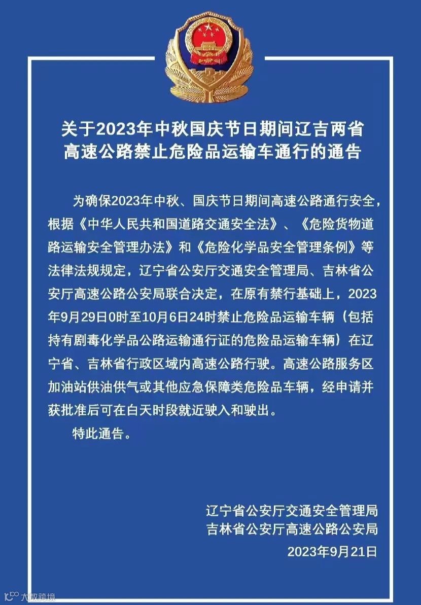 在原有禁行基础上,2023年9月29日0时至10月6日24时禁止危险品运输车辆(包括持有剧毒化学品公路运输通行证的危险品运输车辆)在辽宁省、吉林省行政区域内高速公路行驶。