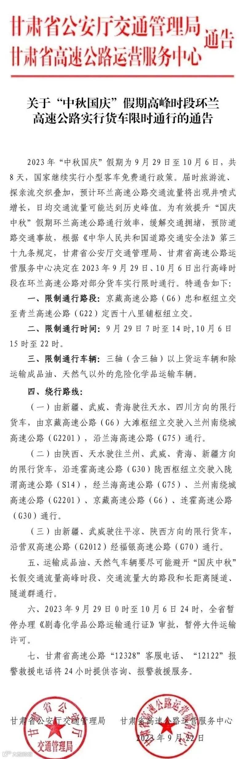 2023 年国庆首期向宁夏高速公路禁止危险化学品运轮车辆和大非运输车领等车辆通行,现通告如下: