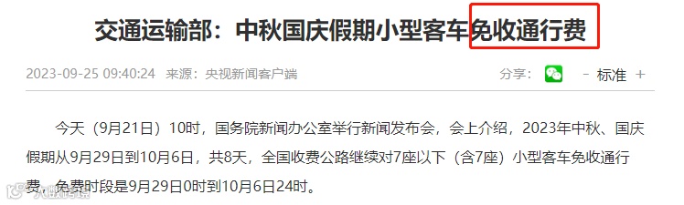 据交通运输部消息,今年的中秋国庆假期,全国小型客车依旧免费通行,时间从9月29日至10月6日。