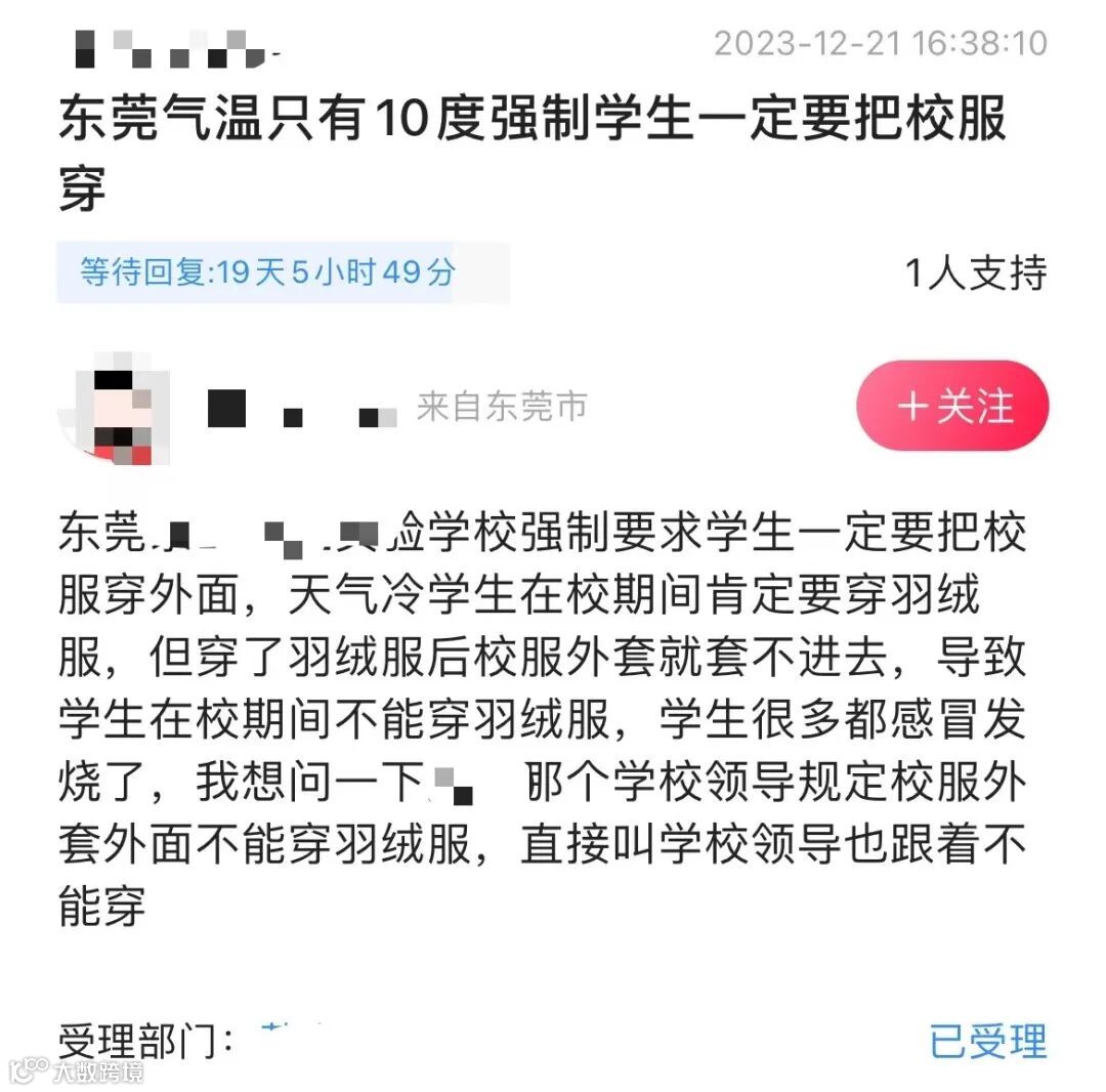 浙江金华也有部分学校通知"可不穿校服"。据金华晚报12月21日报道,东苑小学和金师附小(凤山校区)的家长跟记者分享,“我们教室已经开空调啦,而且不要求孩子必须穿校服哦。”