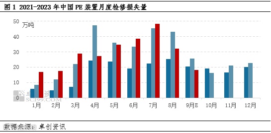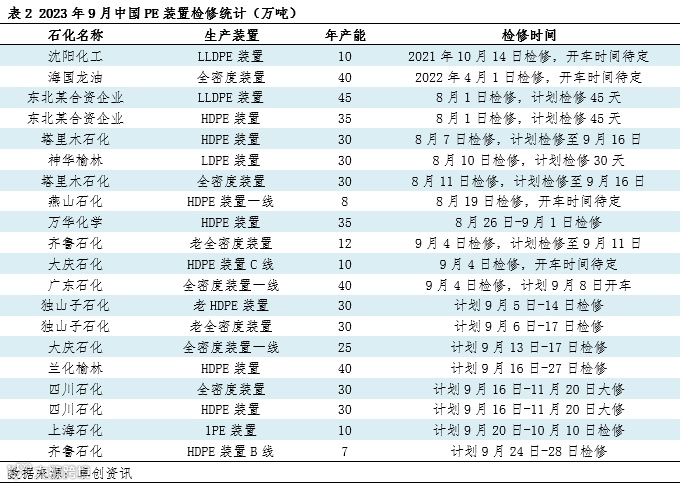 9月来看,部分PE石化装置继续经营性停车,东北某合资企业、神华榆林和塔里木石化等大修装置月内计划开车,9月新增四川石化、上海石化等PE装置大修,其余装置多为小修及中修,9月检修损失量明显减少,检修集中期已结束,且低于2022年同期水平,9月国产供应预计有所增加。