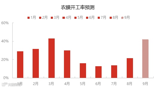 从开工率来看:8月农膜进入储备阶段,虽然较往年有所延后,但部分企业订单累积增加,北方棚膜企业开工率提升,产量想对增加。9月份北方棚膜将逐步进入需求旺季,订单不断跟进,农膜企业开工逐步提升。中大型企业开机较好,基本可达到5-8成,部分中小型企业开机略低。大蒜膜及南方地膜需求逐渐跟进,地膜开机有一定上升空间。白膜需求平淡,预计部分中大企业维持日常开工,其他中小企业预计订单不足,产量较少。9月农膜整体开工预计提升20%左右。