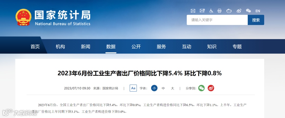 2023年6月份,全国工业生产者出厂价格同比下降5.4%,环比下降0.8%;工业生产者购进价格同比下降6.5%,环比下降1.1%。