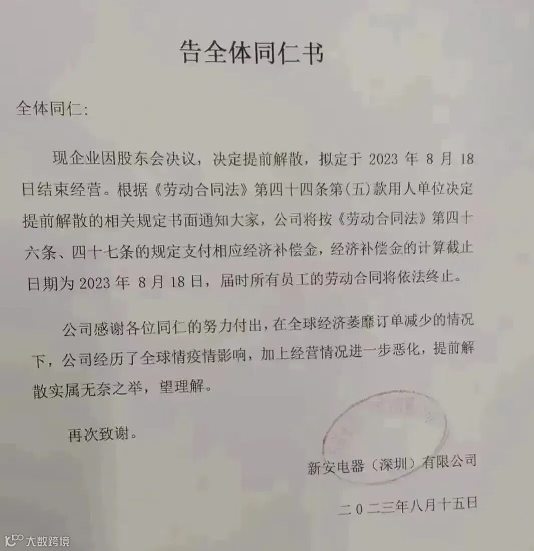 8月16日,有媒体报道,新安电器(深圳)有限公司因经济萎靡订单减少,企业经营情况进一步恶化,决定提前解散,将于2023年8月18日结束经营。
